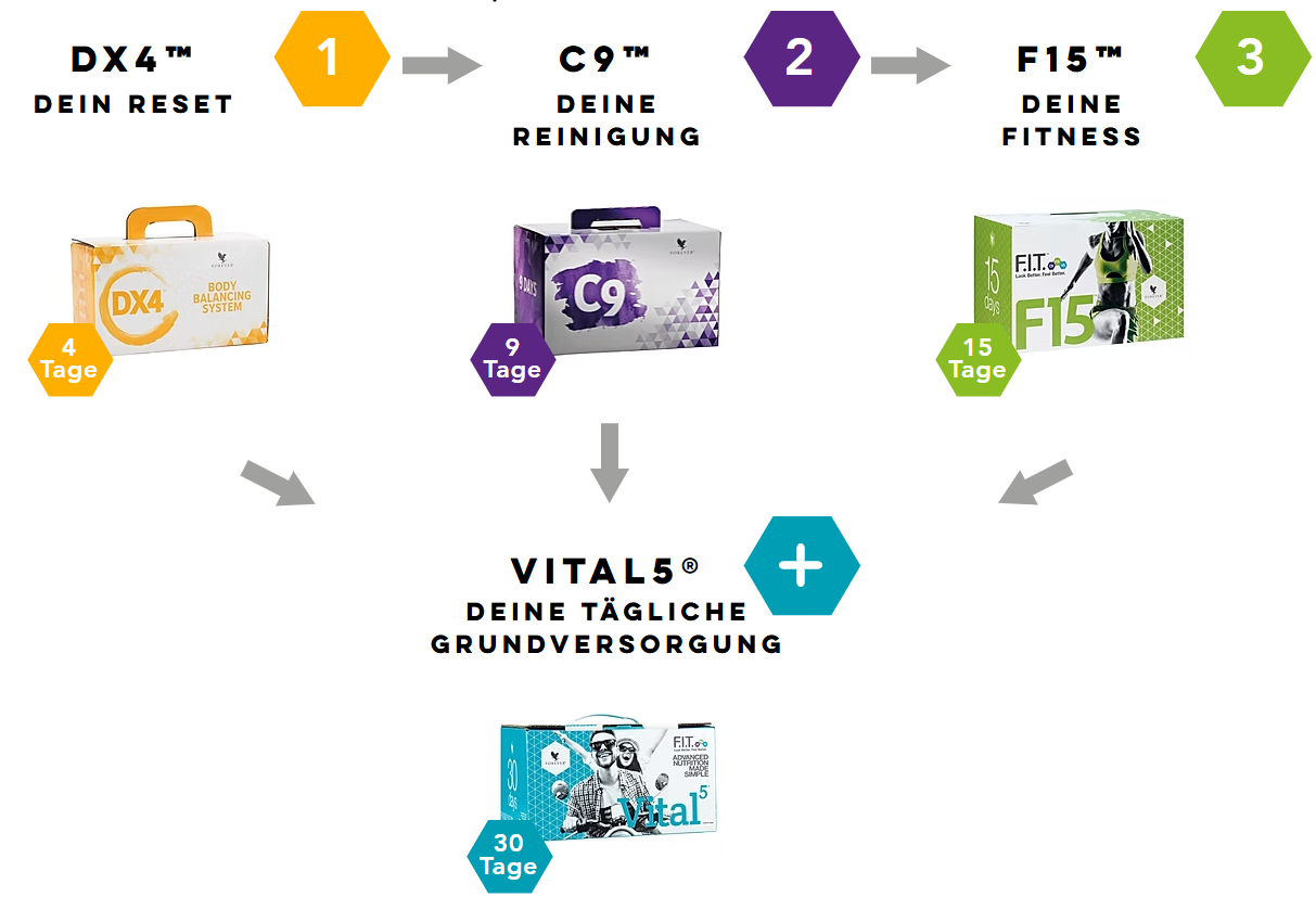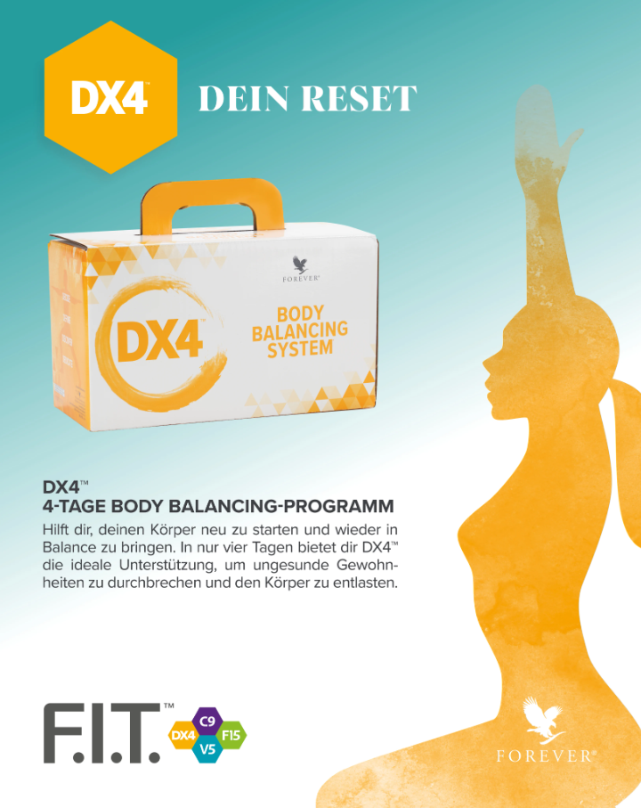 In nur vier Tagen hilft dir dieses effektive Programm, Körper und Geist in Einklang zu bringen und eine gesunde Basis für deinen neuen Lebensstil zu schaffen. Durch eine Kombination aus einem strukturierten Ernährungsplan, dem bewährten Forever Aloe Vera Gel und sechs innovativen Produkten unterstützt DX4™ dich dabei, deinen Körper nachhaltig zu entlasten, zu reinigen und erste, positive Veränderungen zu erleben.
